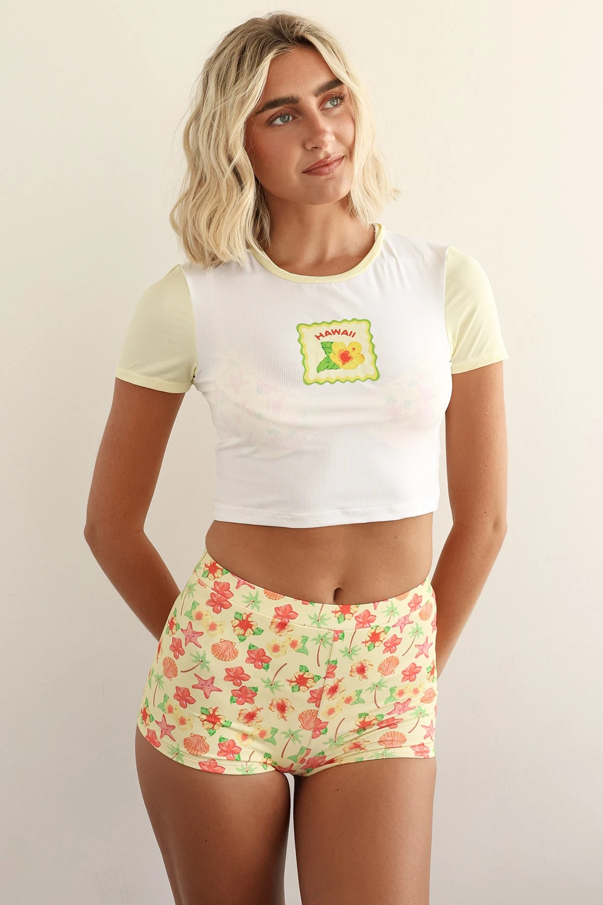 A cropped and classic white baby tee designed with yellow cap sleeves and trim, featuring icons from our Styledbymckenz collab. Pairs well over your favorite βkini or denim shorts for the cutest summer outfit.