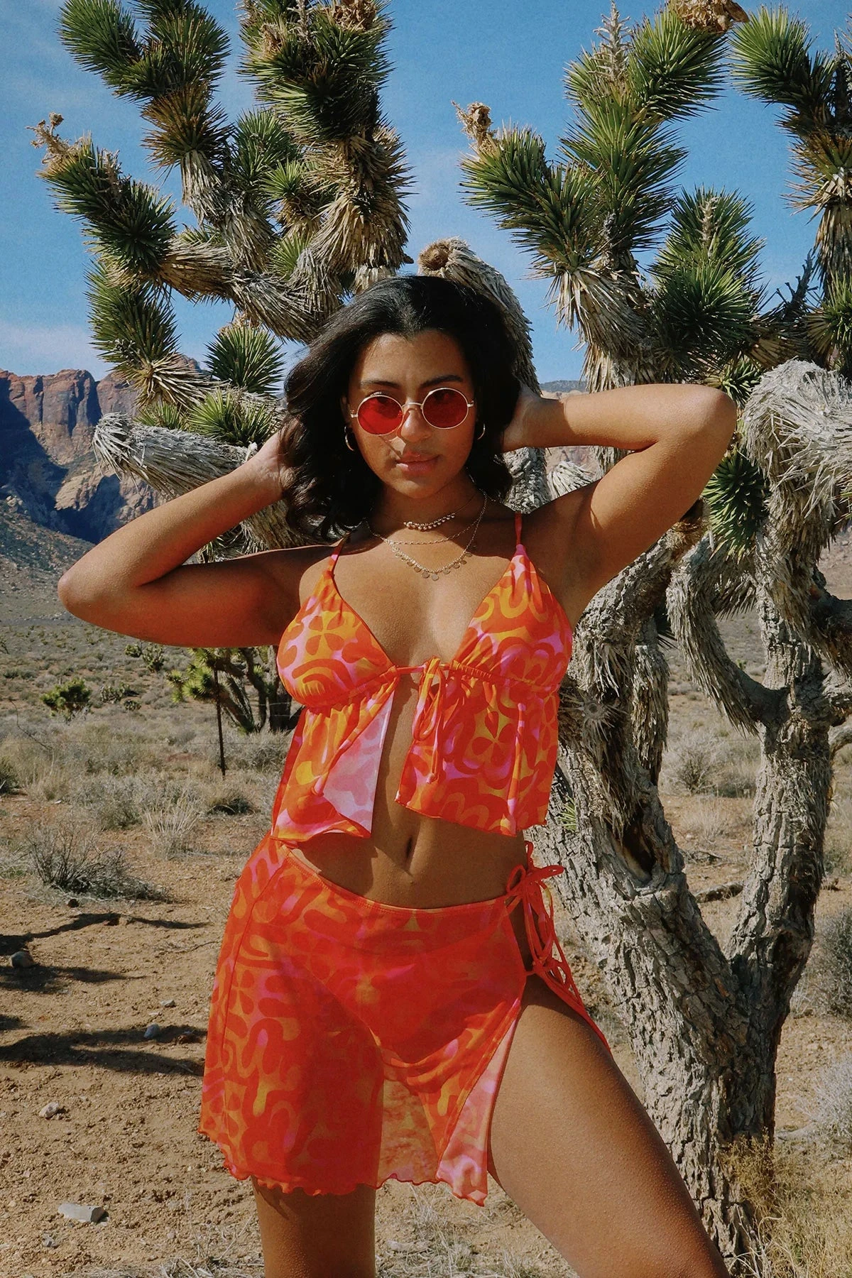Be a Stella in this sheer mesh mini skirt cover up! Whether you’re at the beach or a festival, this double tier side tie detail will be the star of the show. You won’t be blending in with the crowd!